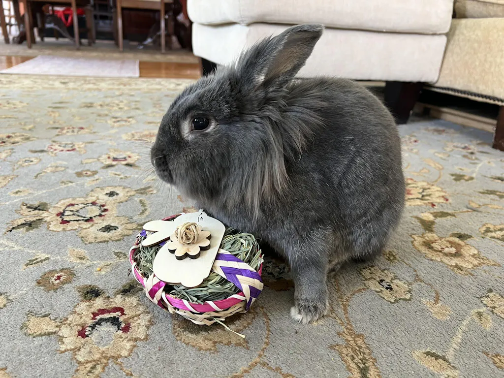 Got this for my sweet lionhead bunny for Easter. She devoured the hay that was inside in one day. I keep refilling it with her regular hay, and she has as much fun with it as she did on the first day! I would definitely buy this again.